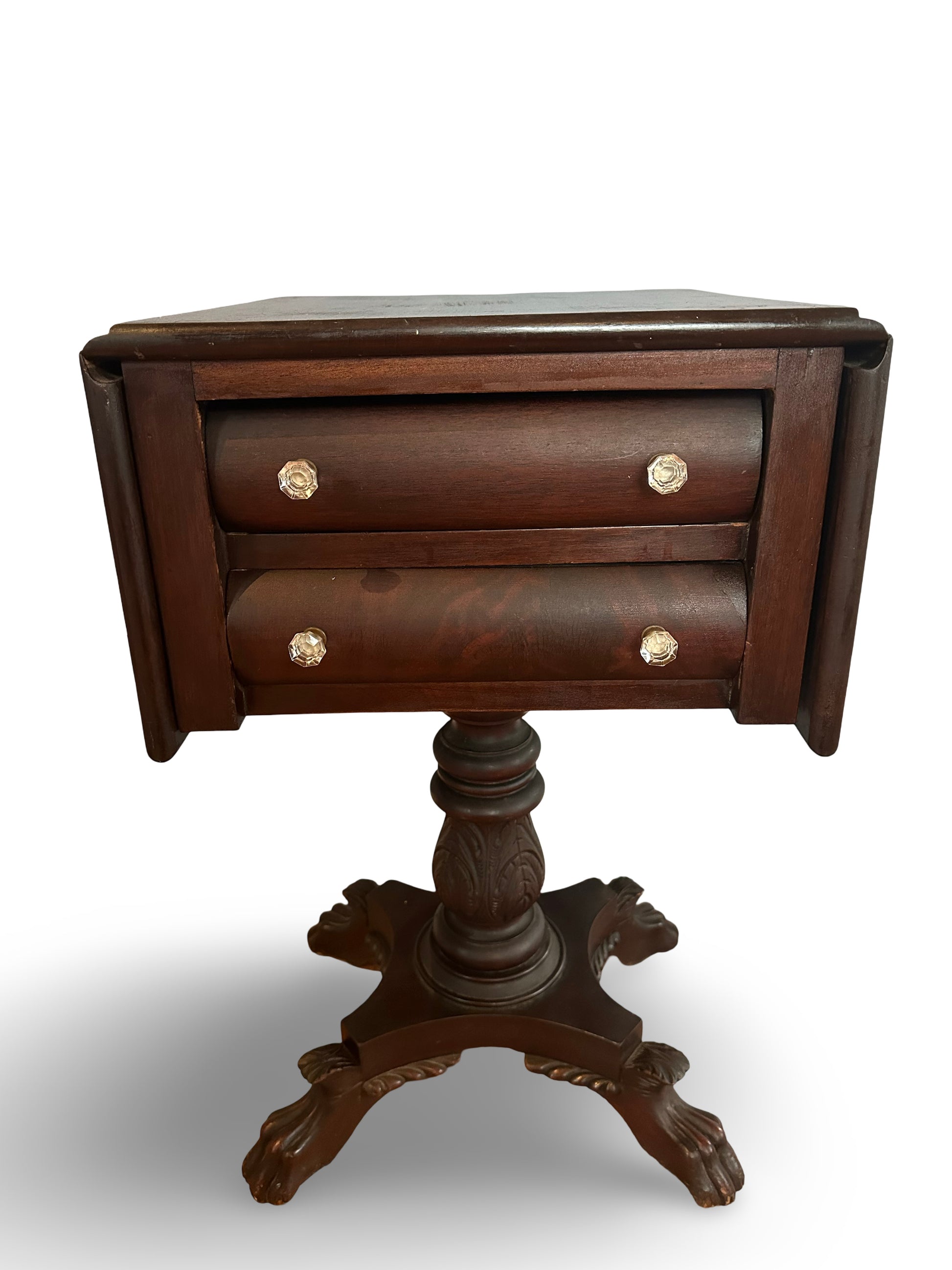 This authentic Empire mahogany end table from the late 1800s showcases timeless craftsmanship with solid wood construction. Features include a practical drop-leaf extension, elegant crystal handles, distinctive claw feet, and two fully functional drawers. A refined addition to any period or eclectic interior.