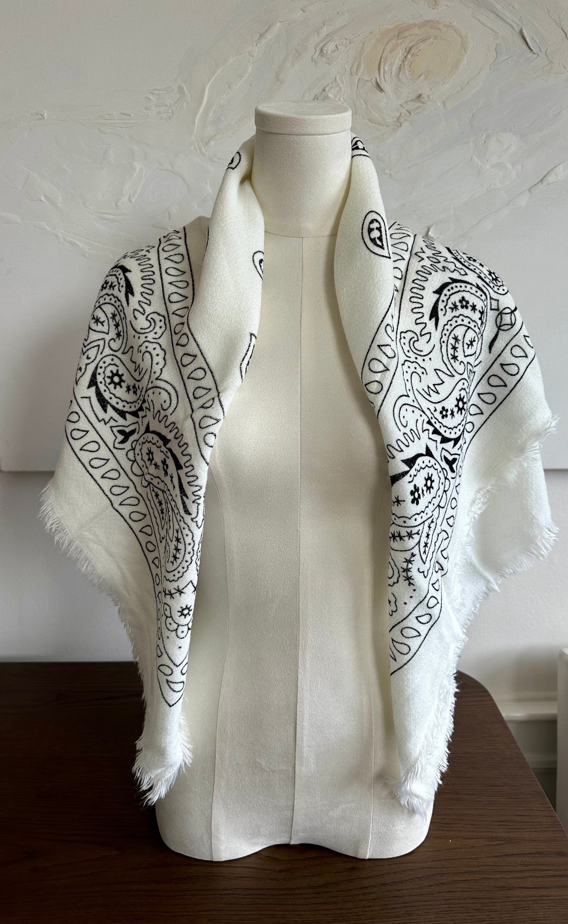 A whisper of Parisian elegance, this 30" bandana scarf arrives from France wrapped in refined simplicity. Woven from a luxurious blend of 70% viscose and 30% wool, it drapes with gentle fluidity and subtle warmth. Whether knotted at the neck, woven through your hair, or draped across your shoulders, this printed design becomes an understated declaration of style—a small luxury that speaks volumes.