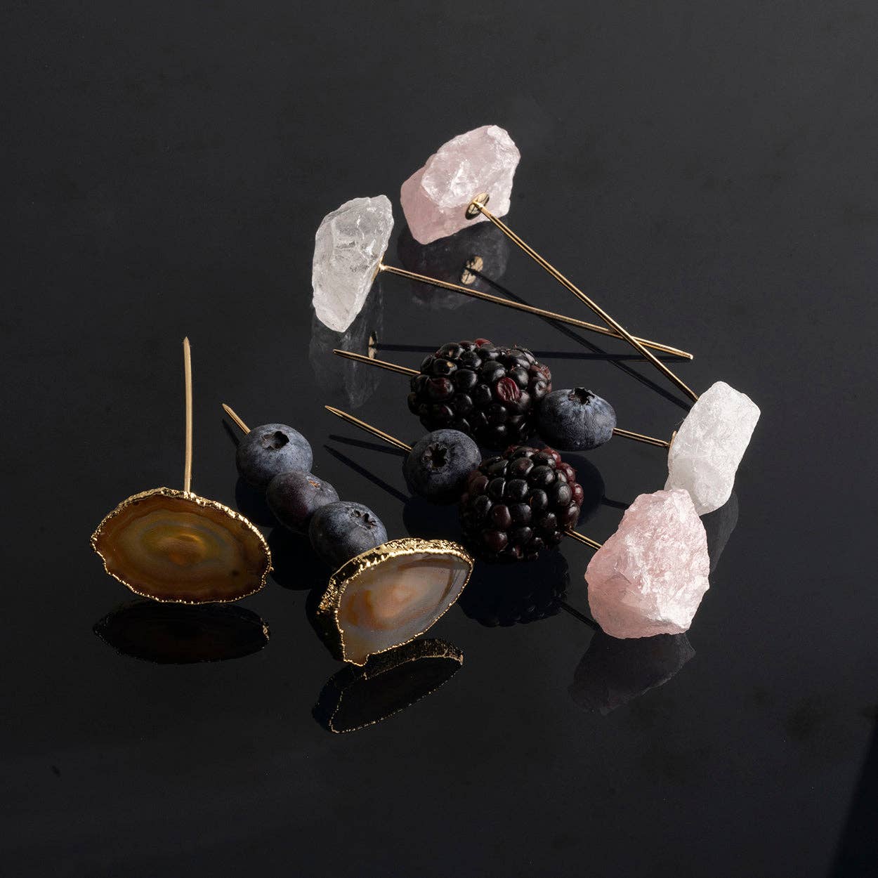 Elevate your presentation with these elegant Hors d'oeuvre Sticks, crafted from durable stone to replace ordinary toothpicks. Each 3-inch stick is adorned with a gold-plated finish and topped with a distinctive, raw white quartz nugget, offering a refined and reusable alternative.