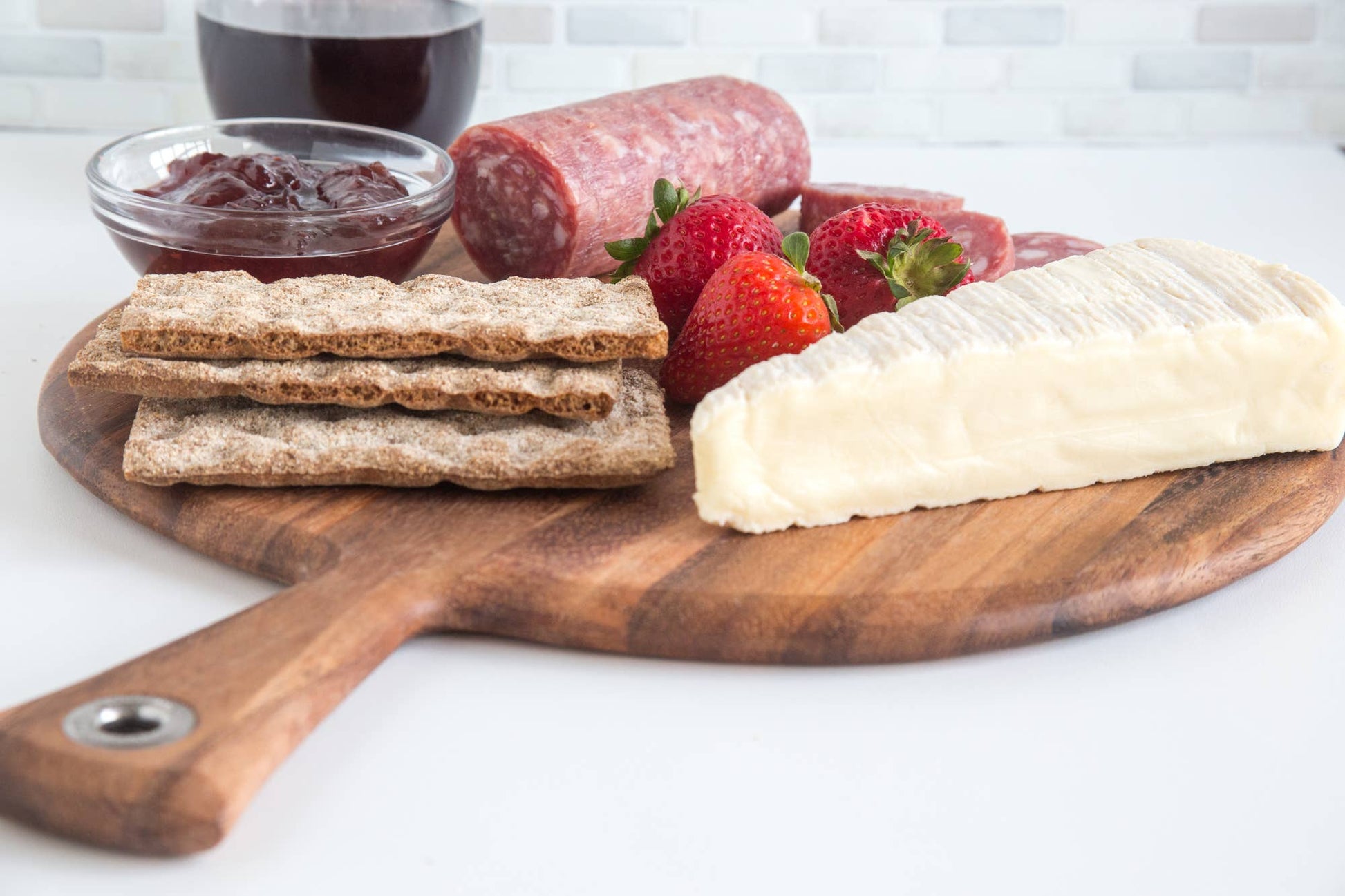 This charming Acacia wood paddle board, designed in North Carolina and made in Thailand, is perfect for serving up your favorite snacks. Its unique grain patterns make each piece one-of-a-kind. Use it for cheese, meats, or nuts—or all at once! Plus, the handy grommet makes wall-hanging a breeze. Measuring 12" x 16" and lightweight, it’s ready for any gathering!