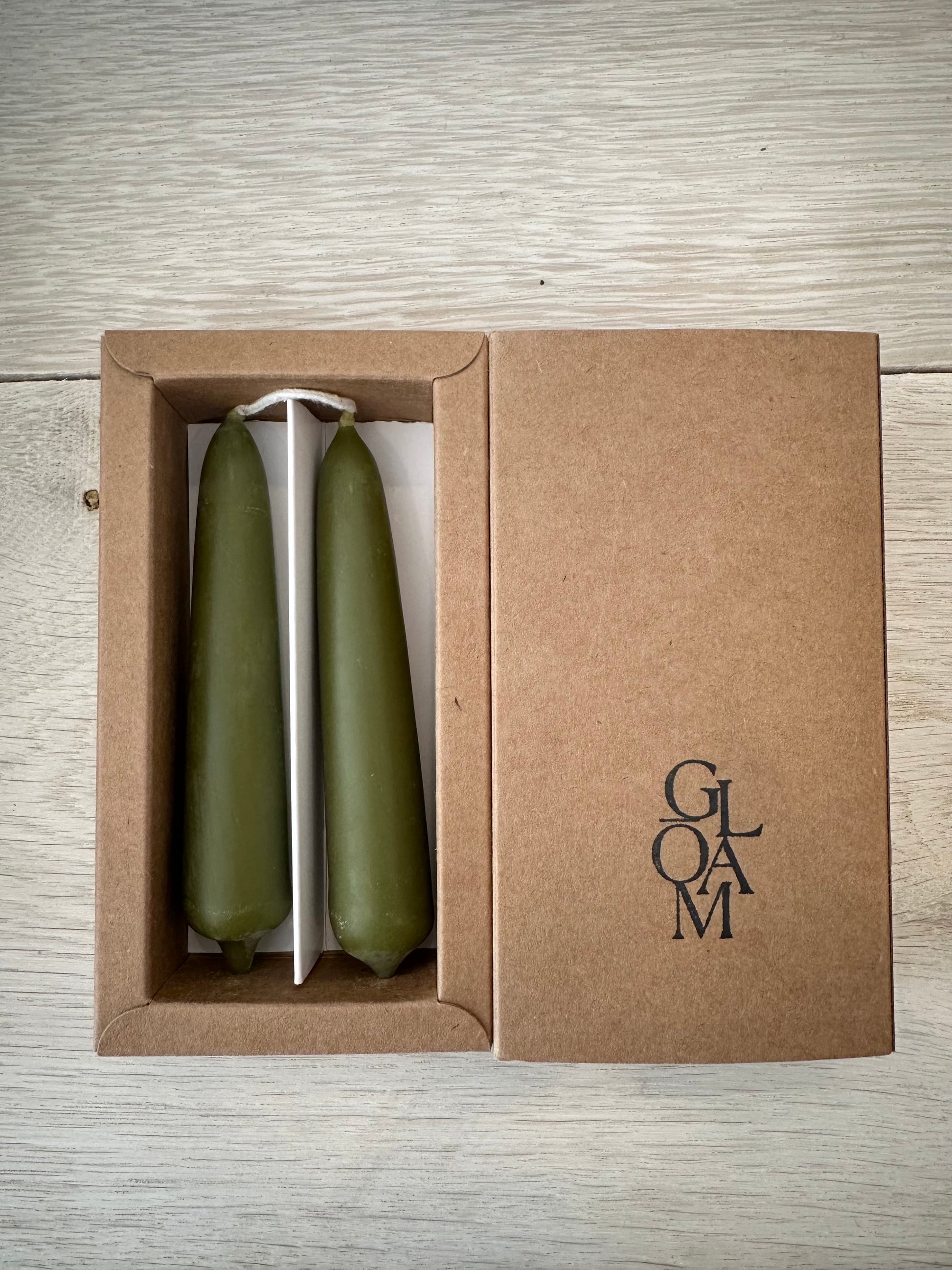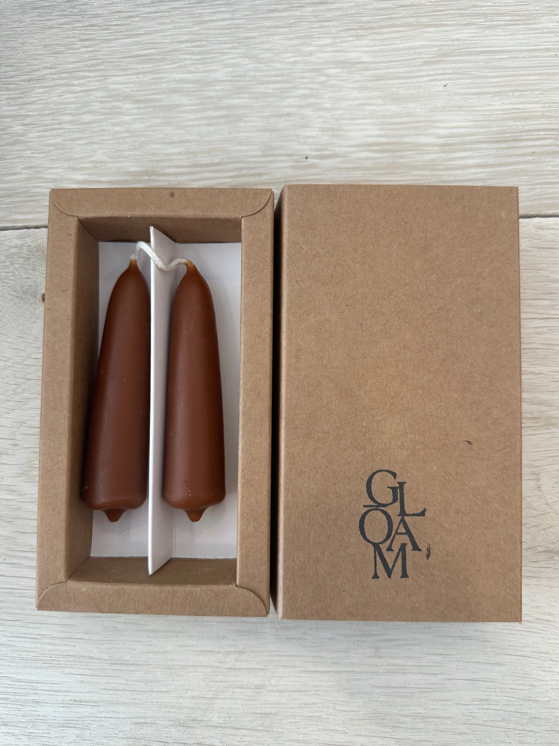 GLŌAM mini tapers candles are a 5" taper pair that are lovely to light for a ritual such a morning coffee, meditating, as Shabbat candles, or while winding down for bed with a book. They are also great to layer on a table scape with other sized tapers for a high-low look. All of our candles are made of natural beeswax and infused with plant based pigments for a luxurious depth of color meant to inspire an elevated daily aesthetic. Burn time 4 hrs.