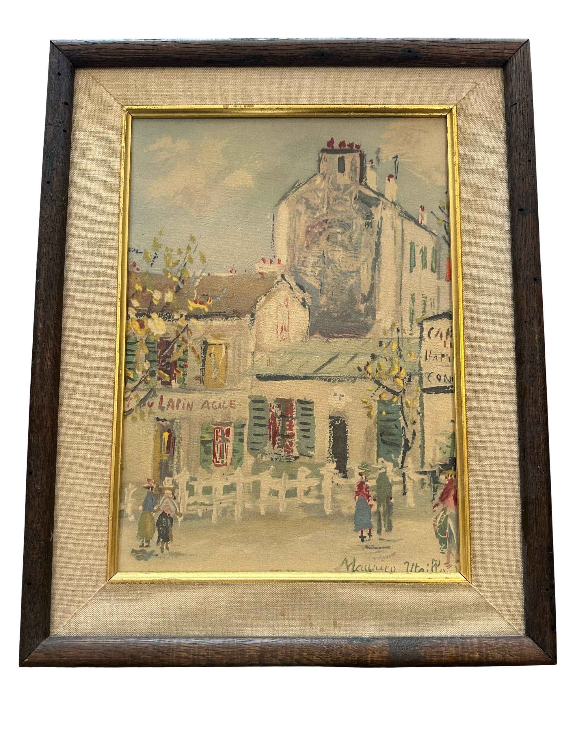 A distinguished reproduction of Maurice Utrillo's iconic rendering of Le Lapin Agile, the legendary Montmartre cabaret. Housed in a refined linen and wood frame, this mid-century print captures the atmospheric charm of Paris's most celebrated bohemian establishment. An elegant addition for collectors of vintage French art and those drawn to the romance of 1950s aesthetics.