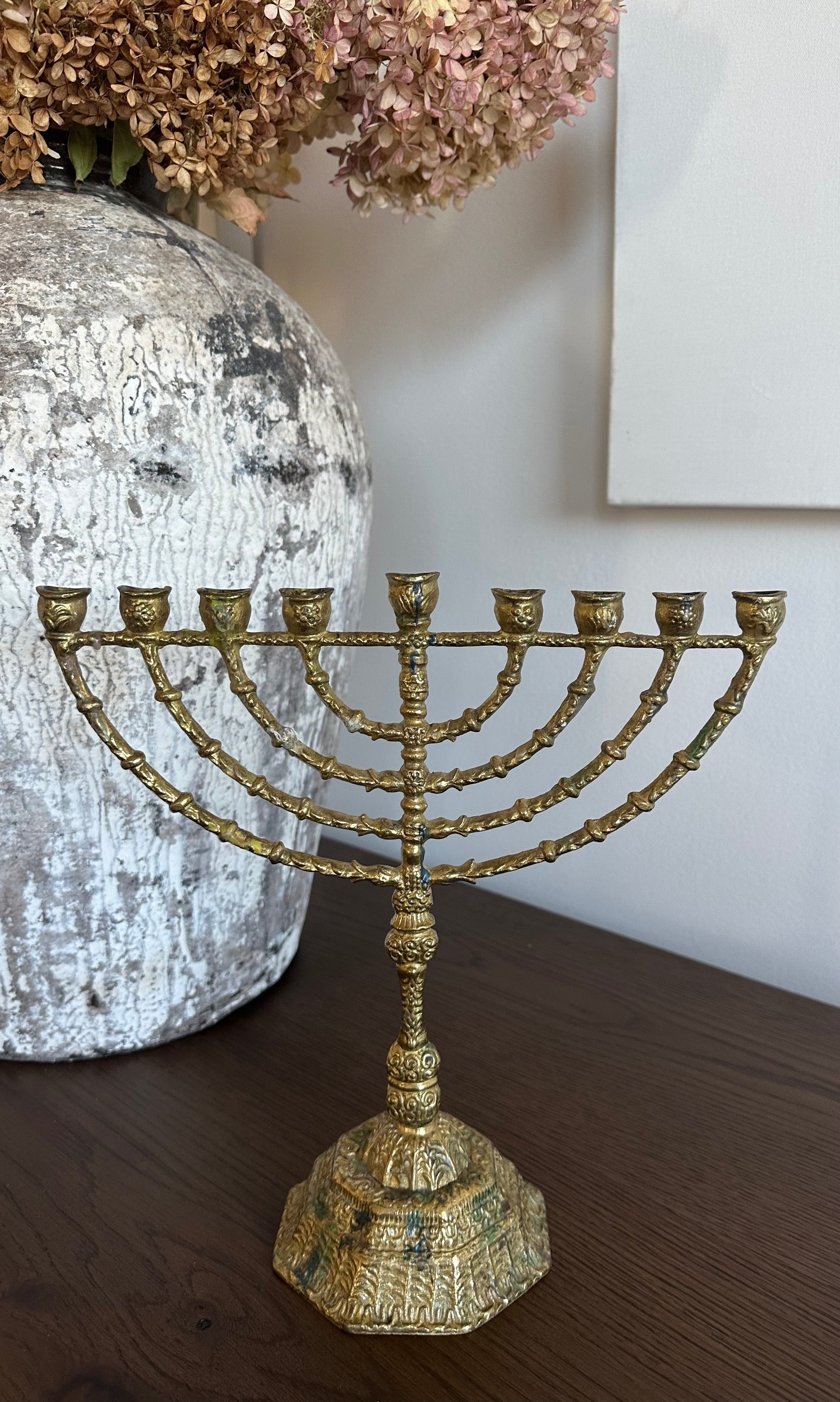 This Vintage Gold Plate Tall Menorah boasts stunning texture detail for a luxurious touch.